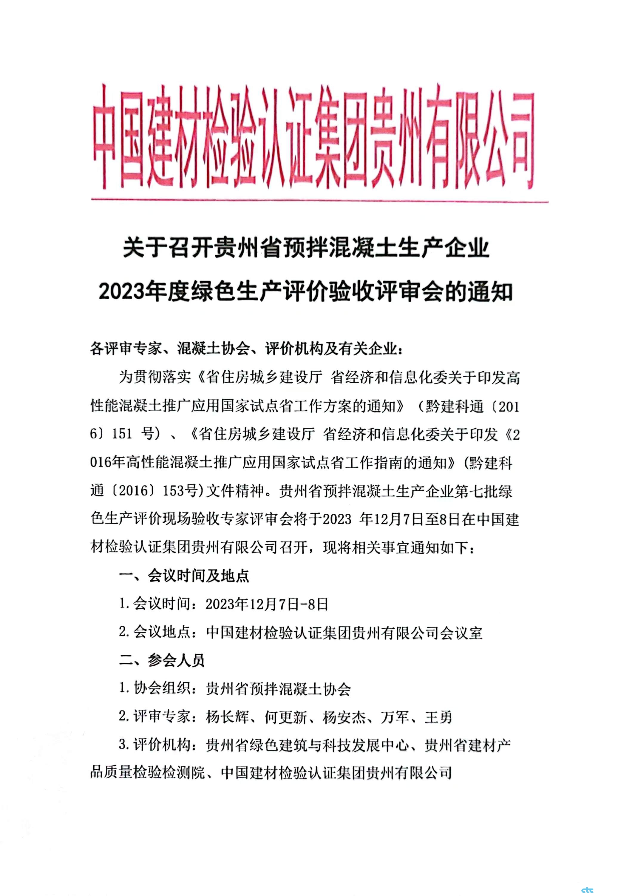 關(guān)于召開貴州省預(yù)拌混凝土生產(chǎn)企業(yè) 2023年度綠色生產(chǎn)評(píng)價(jià)驗(yàn)收評(píng)審會(huì)的通知