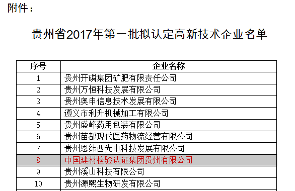 國檢集團(tuán)貴州公司于2017年8月10日作為2017年度貴州省第一批高新技術(shù)企業(yè)予以公示。